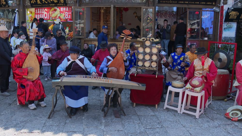下午2點,納西古樂的絲竹聲漫過廣場。老藝人抱著曲項琵琶,敲起云鑼,古樂的旋律像山澗流水淌進人心。圍坐的觀眾中,既有本地長者,也有舉著手機拍攝的“新麗江人”,還有偶然駐足的各地游客。不同口音的交談與樂聲相融,織成一幅溫暖而鮮活的民族團結(jié)畫卷。“這是我第一次聽到這樣的音樂,剛才旁邊的一位爺爺還給我講解了曲牌背后的傳說,這種感覺真的很好?!眮碜灾貞c的游客范正彬笑呵呵地說。